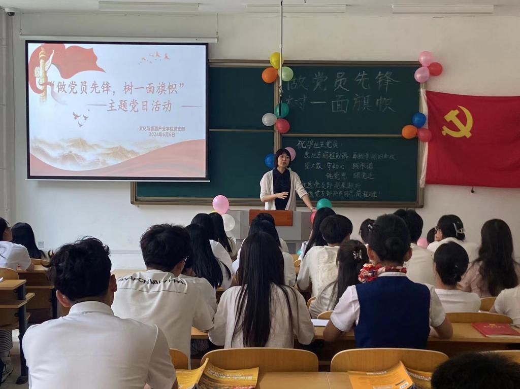 活动在全体党员共同奏唱中华人民共和国国歌中拉开序幕。首先,季忆留夏、华章持续,大家一起观看提前为毕业生党员录制的祝福视频,党员同志纷纷表达了对毕业生的祝愿,希望毕业生党员能够始终坚定理想信念,也祝愿各位毕业生党员前程似锦,毕业快乐。其次,优秀毕业生党员做经验分享,各位毕业生党员积极分享自己四年的老员工活,回顾老员工活的点点滴滴并从学习、生活以及工作等方面做出自己的经验分享,同时对未毕业的党员同志送出自己最真挚的祝愿,希望各位党员同志在接下来的大学时光里可以不忘初心,砥砺前行,接续奋斗,再创佳绩。再次,文化与旅游产业公司党支部负责人庞锦同志表达了对毕业生美好的祝愿并进行总结发言,她强调,员工党员作为青年中的先进群体,希望大家不忘入党初心,不负时代所托,奋力书写为中国式现代化挺膺担当的青春篇章,并祝愿即将毕业的党员同志绽放出属于自己的光彩。最后庞锦同志带领全体党员重温入党誓词,全体党员举起右拳,神情庄重、声音铿锵、句句千钧,面对鲜红的党旗,重温入党时的决心和信念。