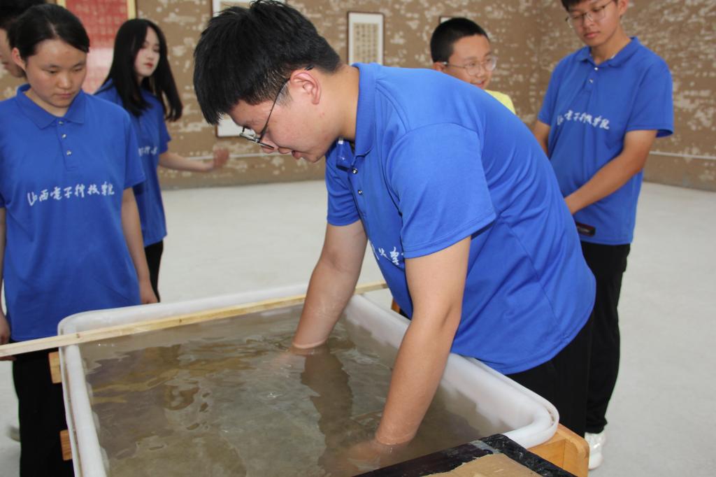 最后一站去到了襄汾县邓庄平阳麻笺产业园,“平阳麻笺”是我们国家的国粹、是老祖宗留下的瑰宝,是四大发明之一。襄汾县邓庄丁陶麻笺社是国家文化部认定的国家级非物质文化遗产“平阳麻笺”的保护单位,7月8日上午十二点,团队全体成员到达位于邓庄的平阳麻笺产业园。讲解员介绍了平阳麻笺的制作过程和发展历史,队员了解到平阳麻笺具有纤维长、拉力强、色泽优等特点,做一张麻纸要经过铡麻、折麻、晒纸、整纸等12道复杂的工序;每一步都需要匠人凭借丰富的经验和精湛的技巧进行操作,以保证麻笺的品质,团队成员在老师傅的带领下亲身体验了制作平阳麻笺的过程,一搅、一抄、一抬,在水里捞两次半,一张完整的湿纸便制作完成。讲解员说匠人们还需根据天气、湿度等自然条件调整制作工艺,确保麻笺的质地和色泽达到最佳状态,而手工艺人在制作过程中也尽量保持原材料的自然状态,这种对自然的敬畏和尊重可以珍惜和爱护我们的环境。